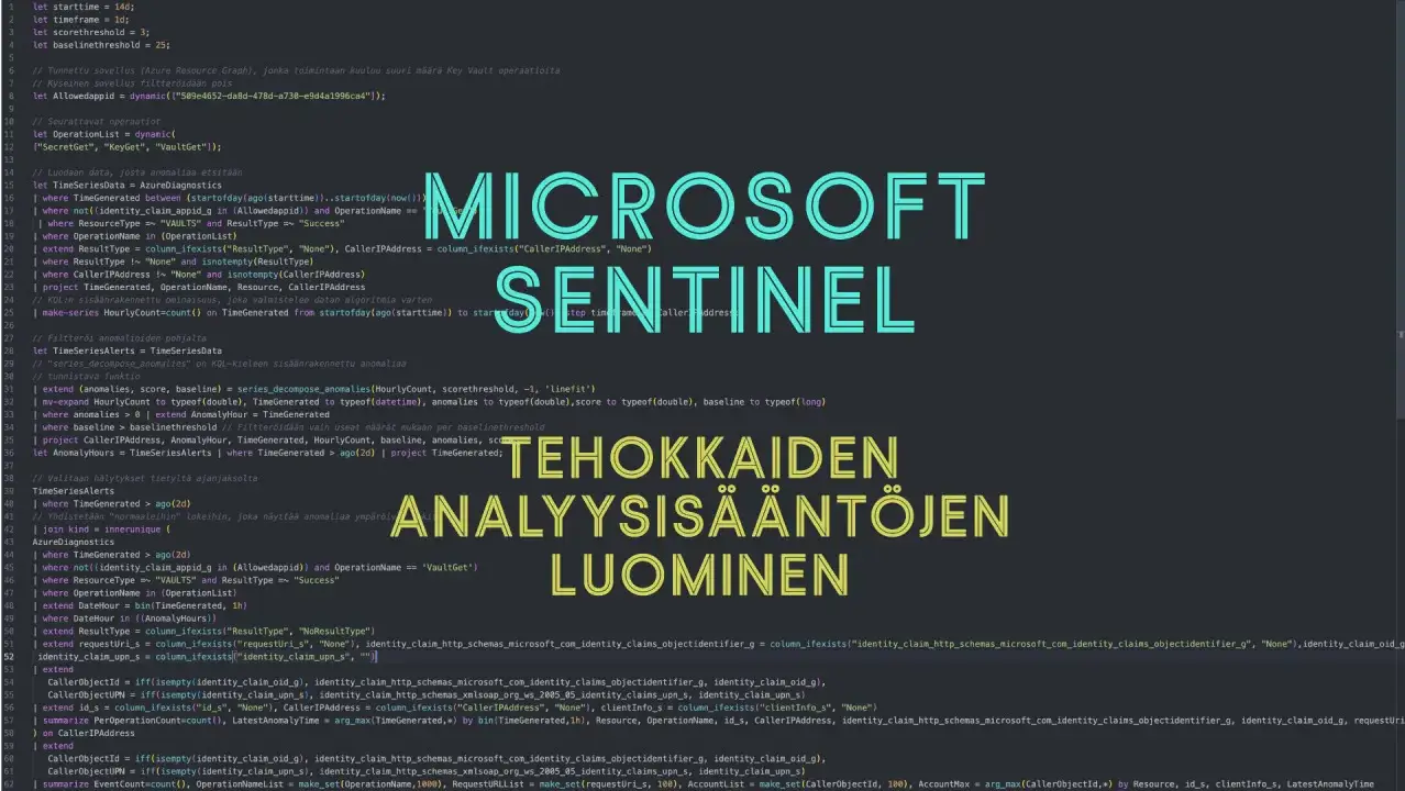Yllä oleva koodipätkä on lähtöisin Microsoftin yhteisöltä, jossa on useita valmiiksi rakennettuja analyysisääntöjä julkisesti saatavilla. Tässä linkki: https://github.com/Azure/Azure-Sentinel/blob/master/Solutions/Azure%20Key%20Vault/Analytic%20Rules/TimeSeriesKeyvaultAccessAnomaly.yaml .